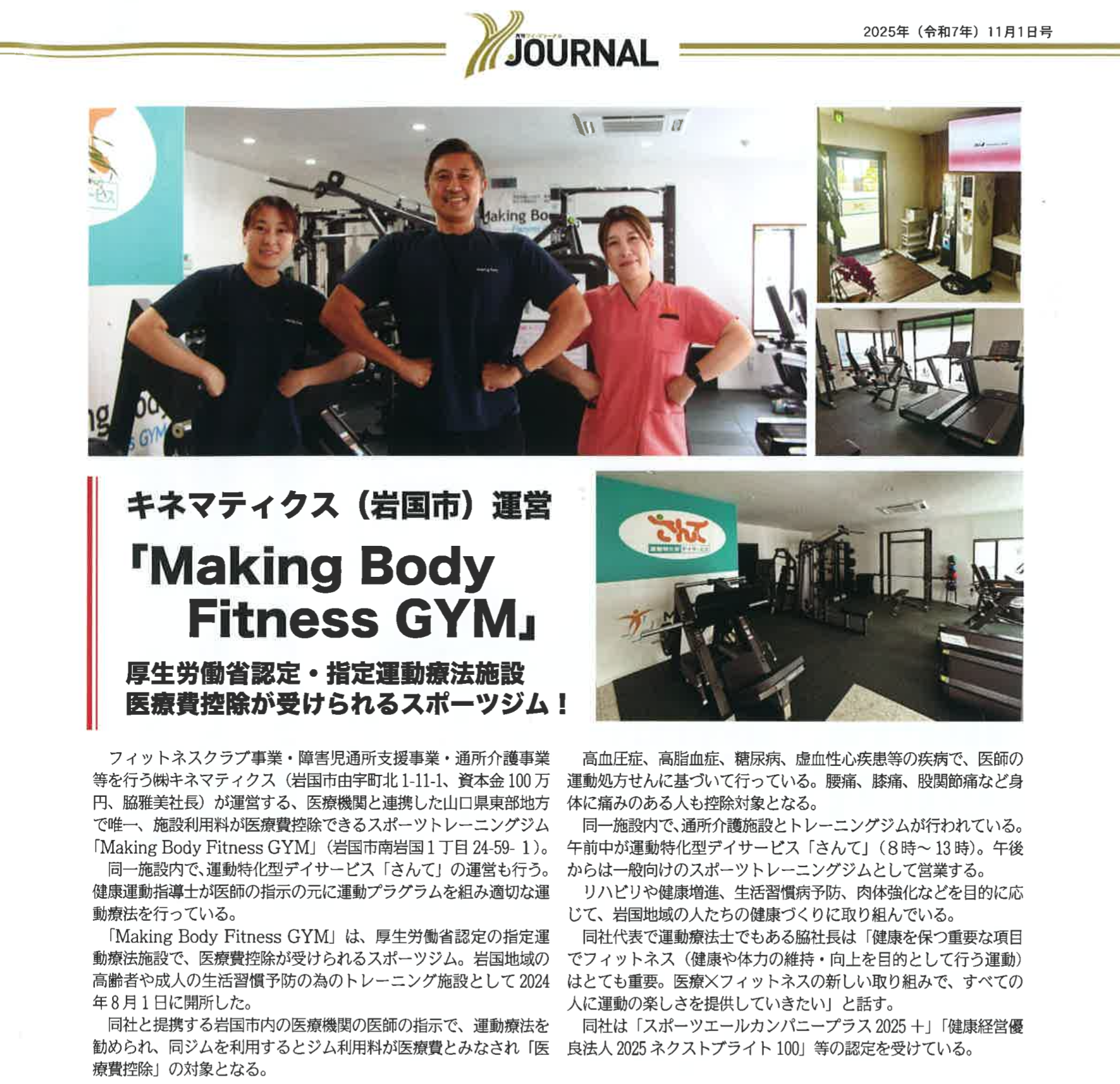山口経済ジャーナル掲載 未分類 2025.11.05 この度、山口経済ジャーナルさんに取材をして頂き、掲載して頂きました。 フィットネスジムでの医療費控除についてとこれからの取り組み、私たちの思いを丁寧に記事にして頂いております。 この度は取材して頂き誠にありがとうございました。